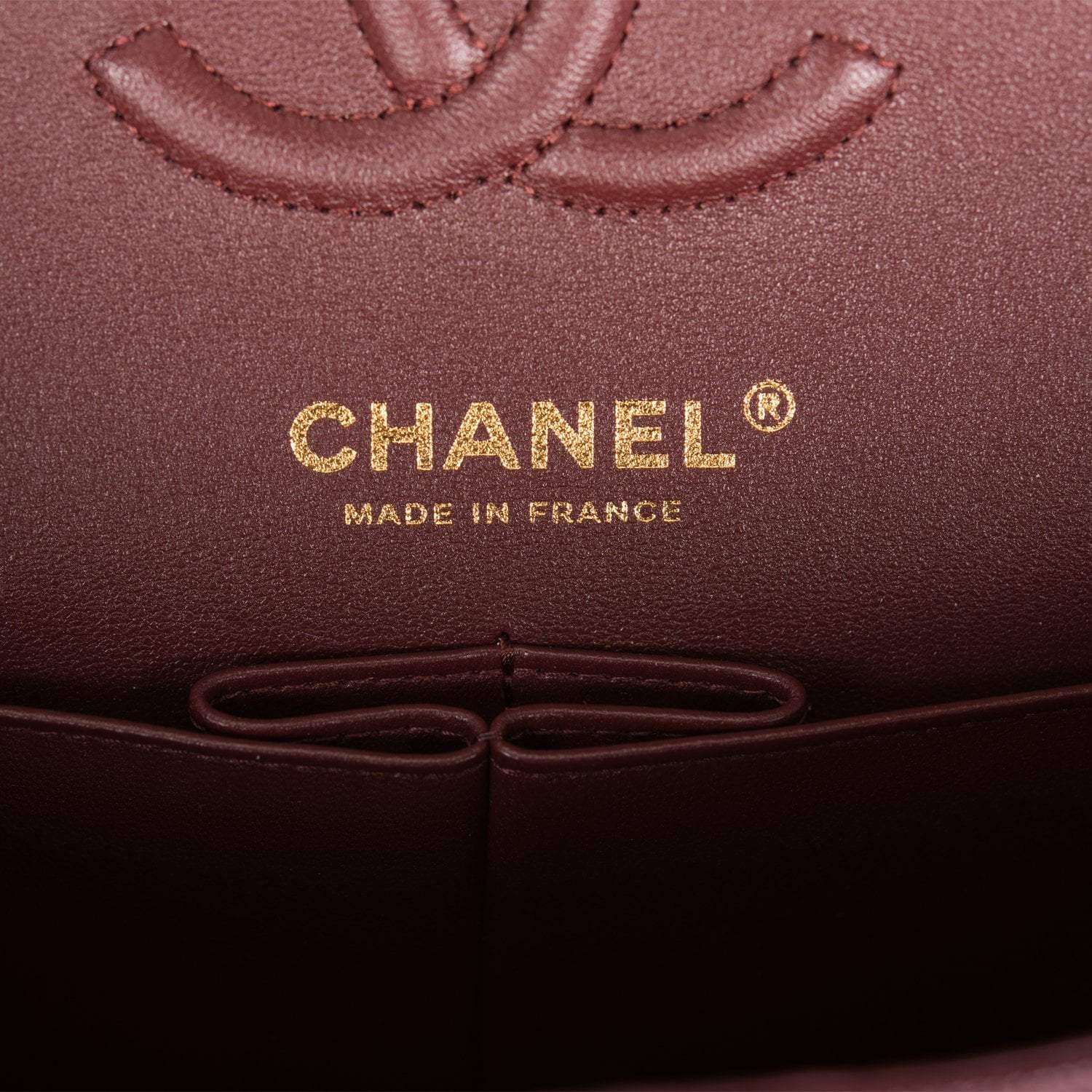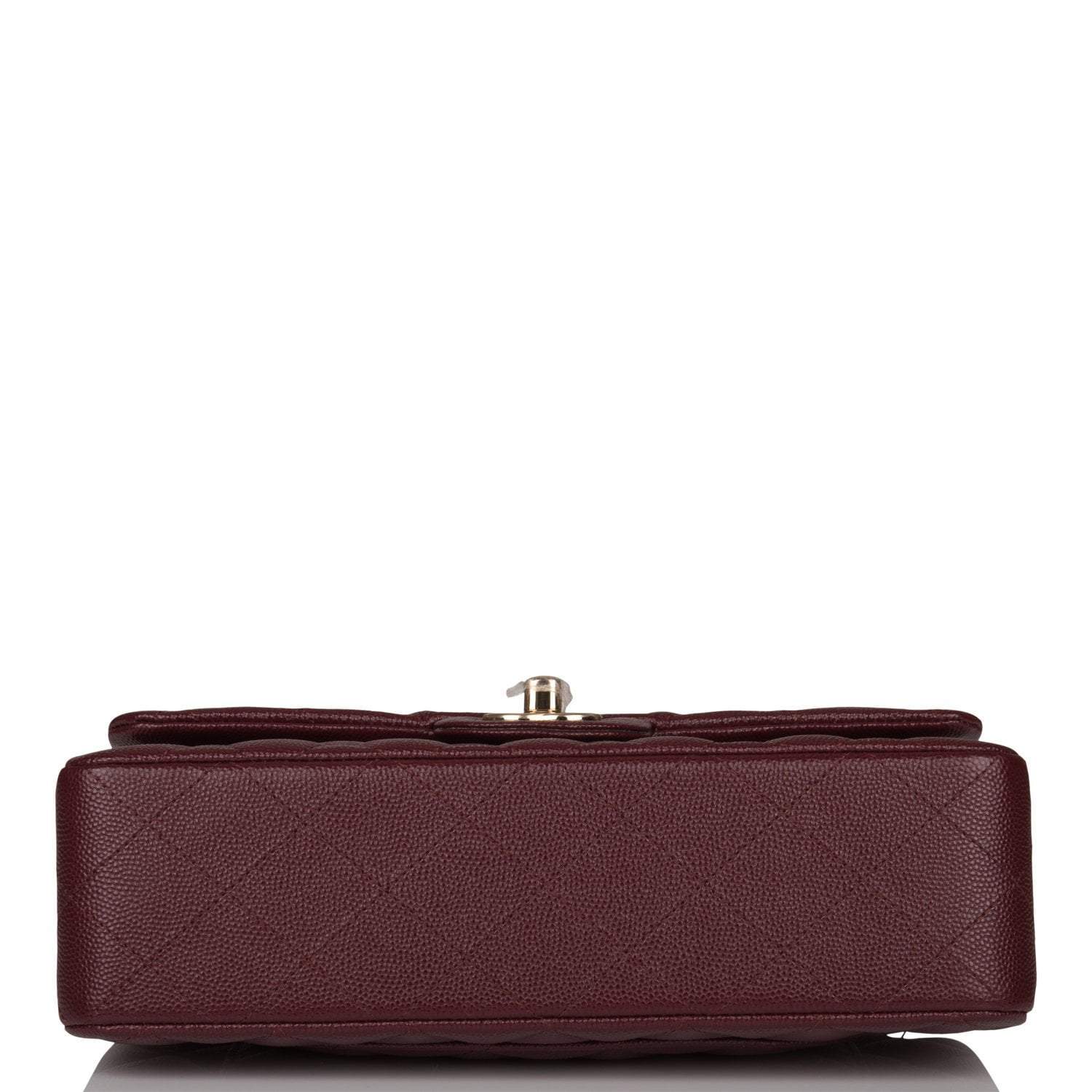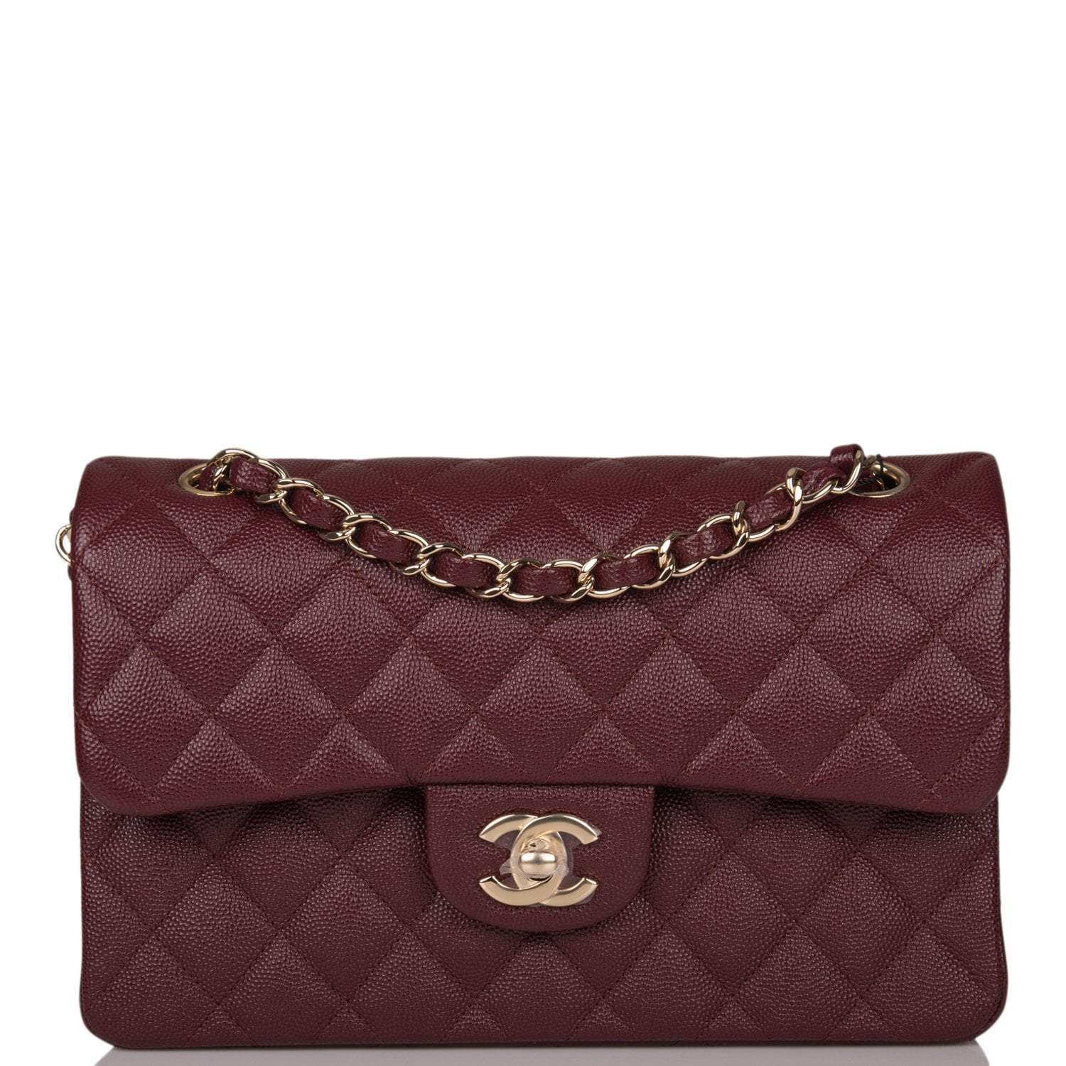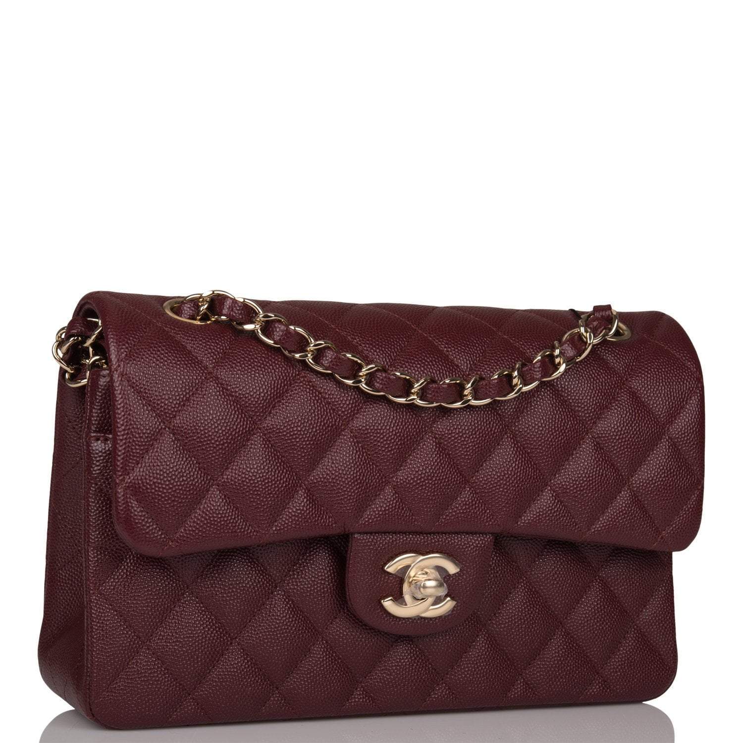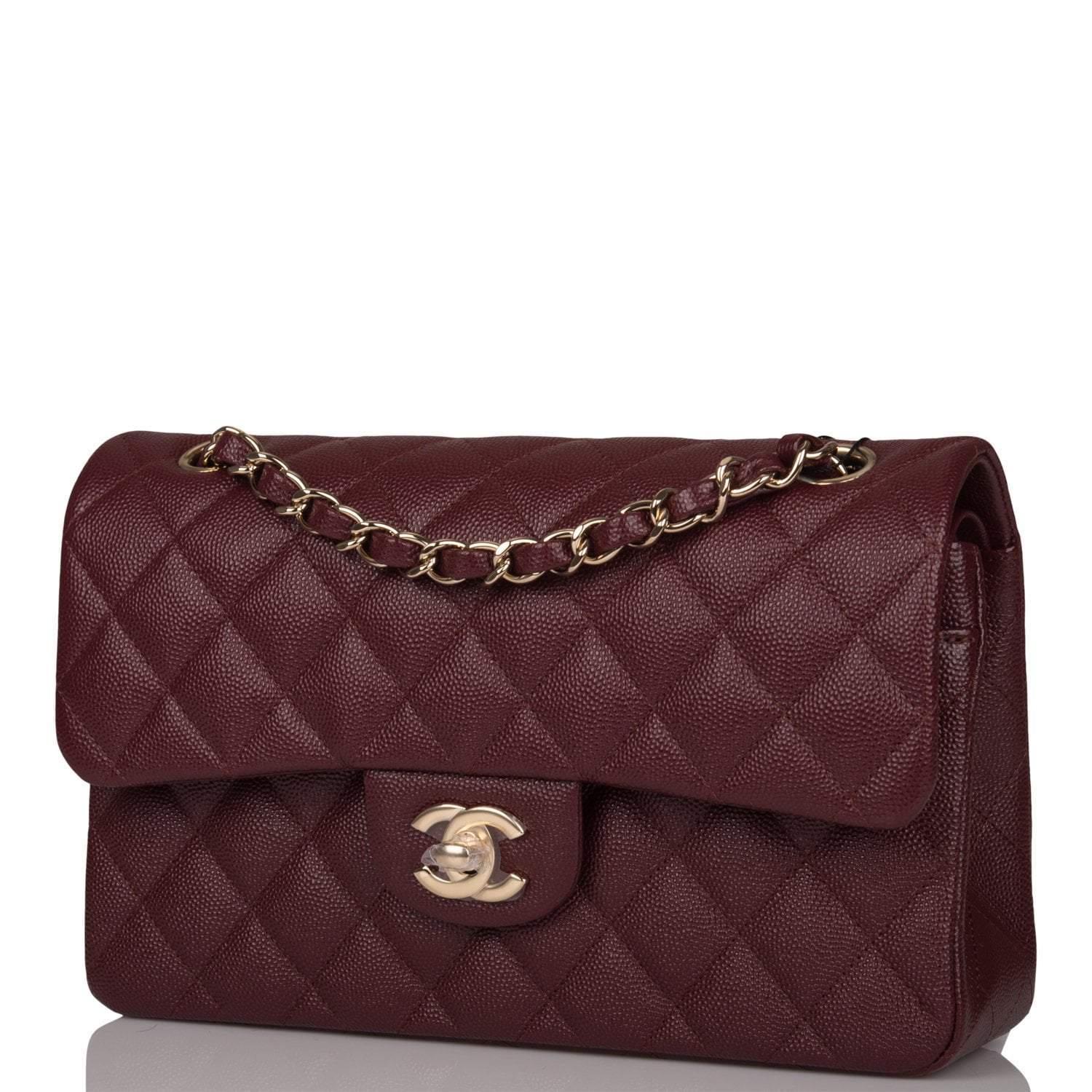 This Small Classic Double Flap bag is in burgundy caviar leather with light gold tone hardware and features a front flap with signature CC turnlock closure, half moon back pocket, and adjustable interwoven light gold tone chain link and burgundy leather shoulder strap.
