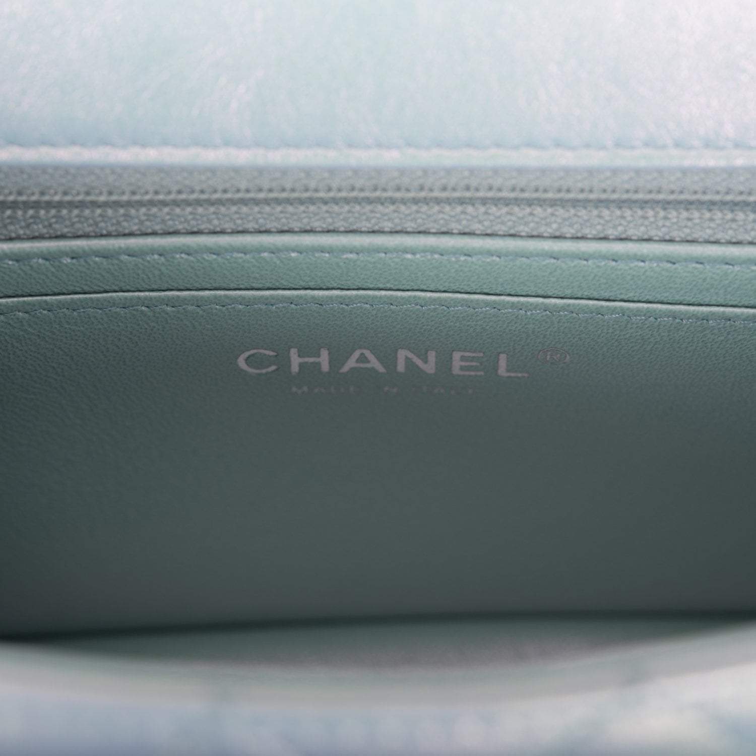 The interior is lined in blue iridescent leather and features a zipper pocket with Chanel pull and an open pocket below.