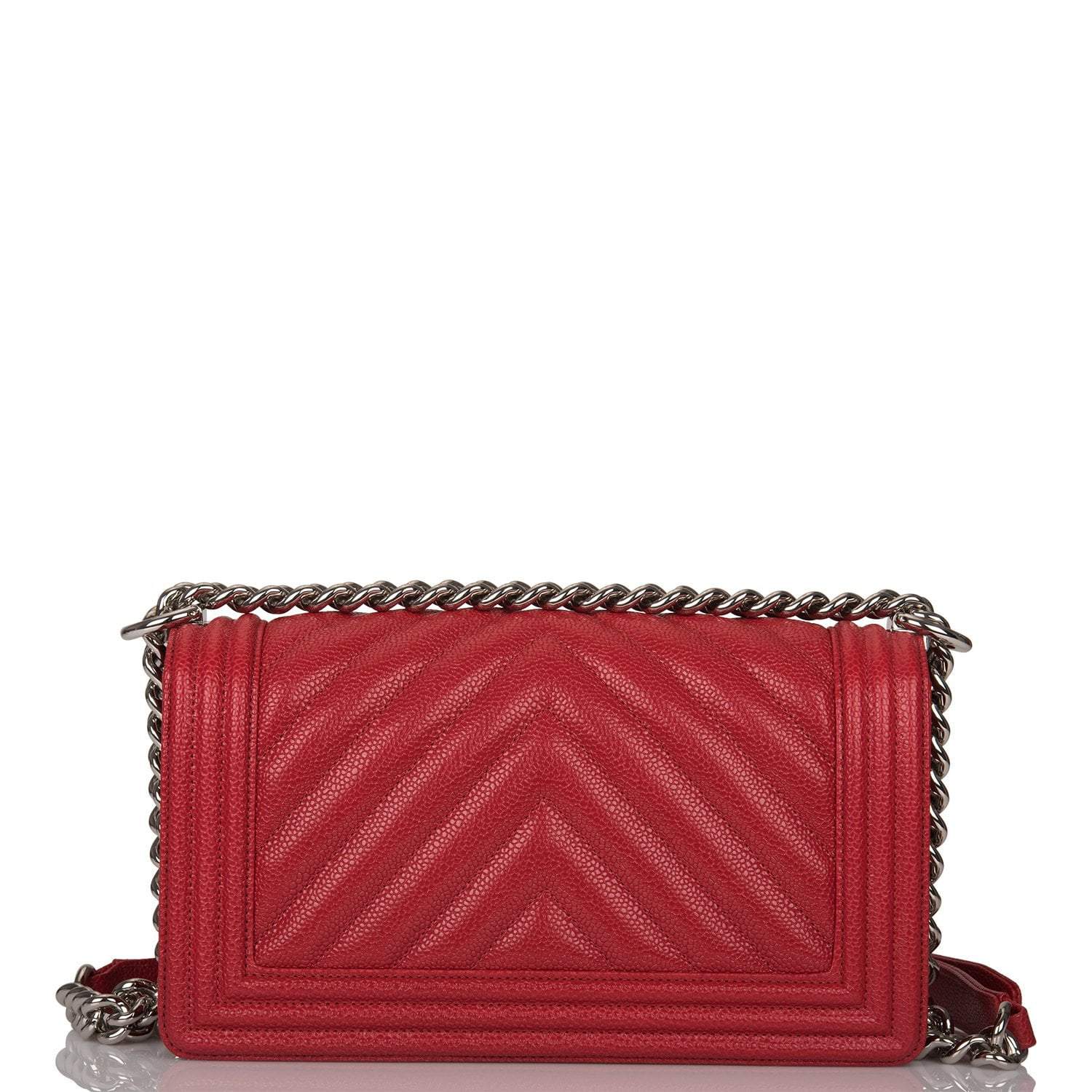 Chanel Red Chevron Caviar Medium Boy Bag Silver Hardware