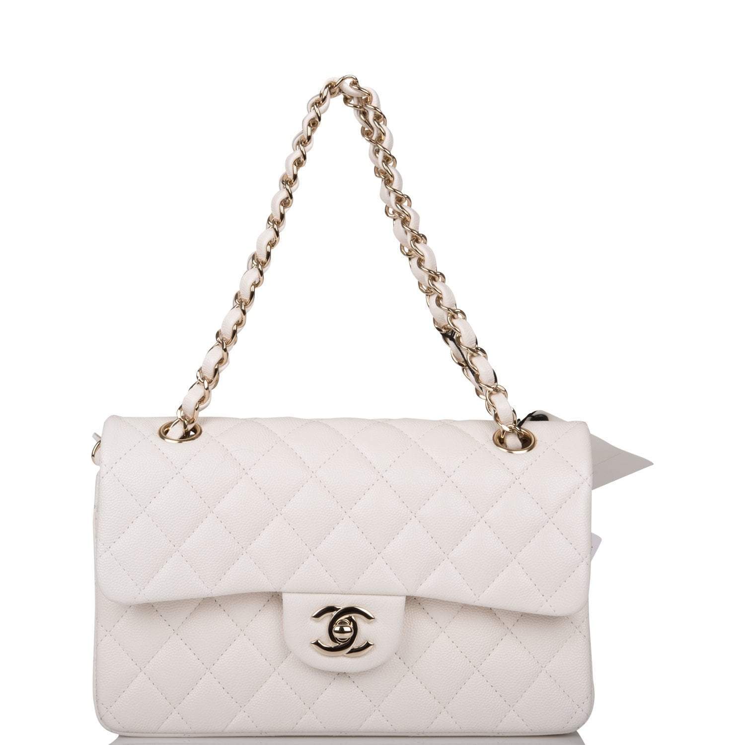 This Small Classic Double Flap bag is in white caviar leather with light gold tone hardware and features a front flap with signature CC turnlock closure, half moon back pocket, and adjustable interwoven light gold tone chain link and white leather shoulder strap.