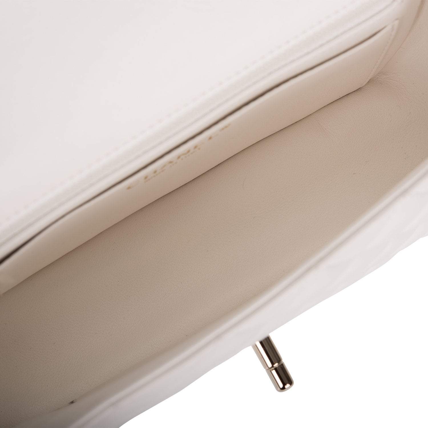 This Mini Rectangular flap bag is of white lambskin leather with light gold tone hardware and has a front flap with signature CC turnlock closure, rear half moon pocket, single interwoven white leather and light gold tone chain link shoulder/crossbody strap.