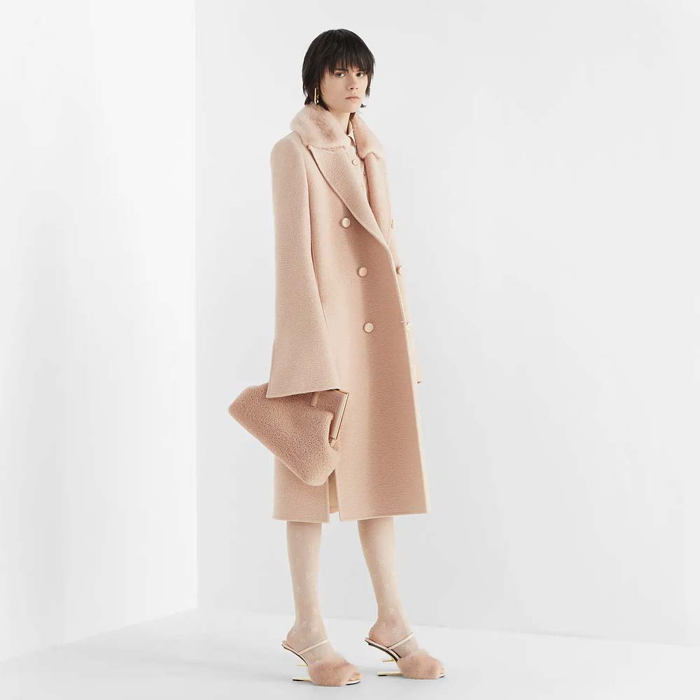 Medium Fendi First bag made of soft, pale pink merino sheepskin with oversized metal F clasp bound in tone on tone nappa leather.