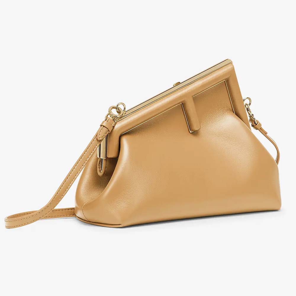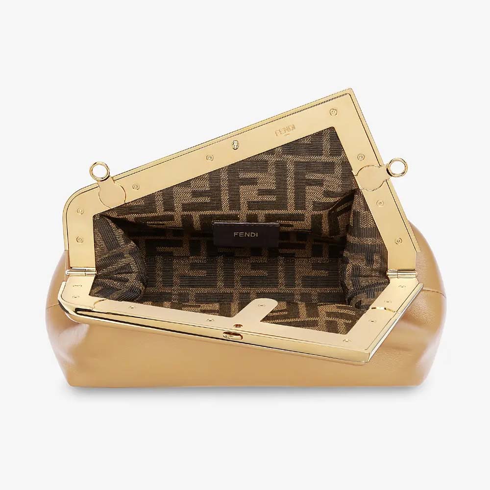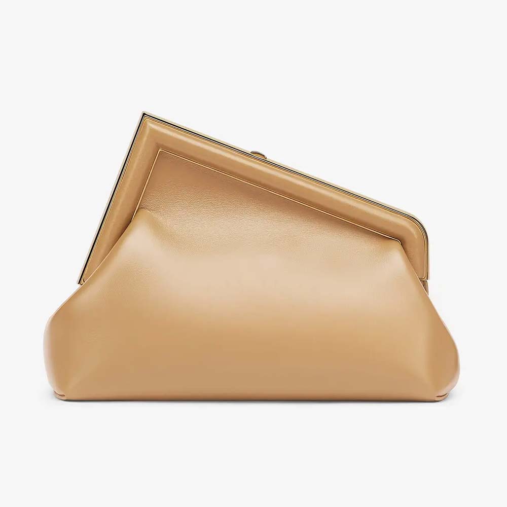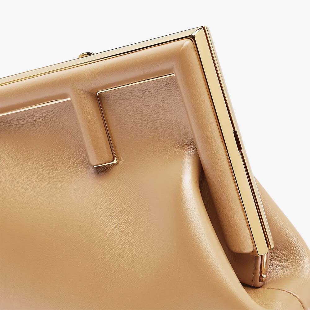 Small Fendi First bag made of soft, beige nappa leather with oversized metal F clasp wrapped in tone on tone nappa leather.
