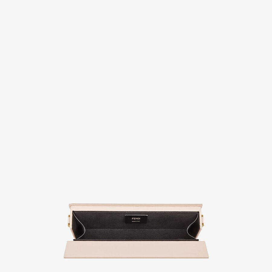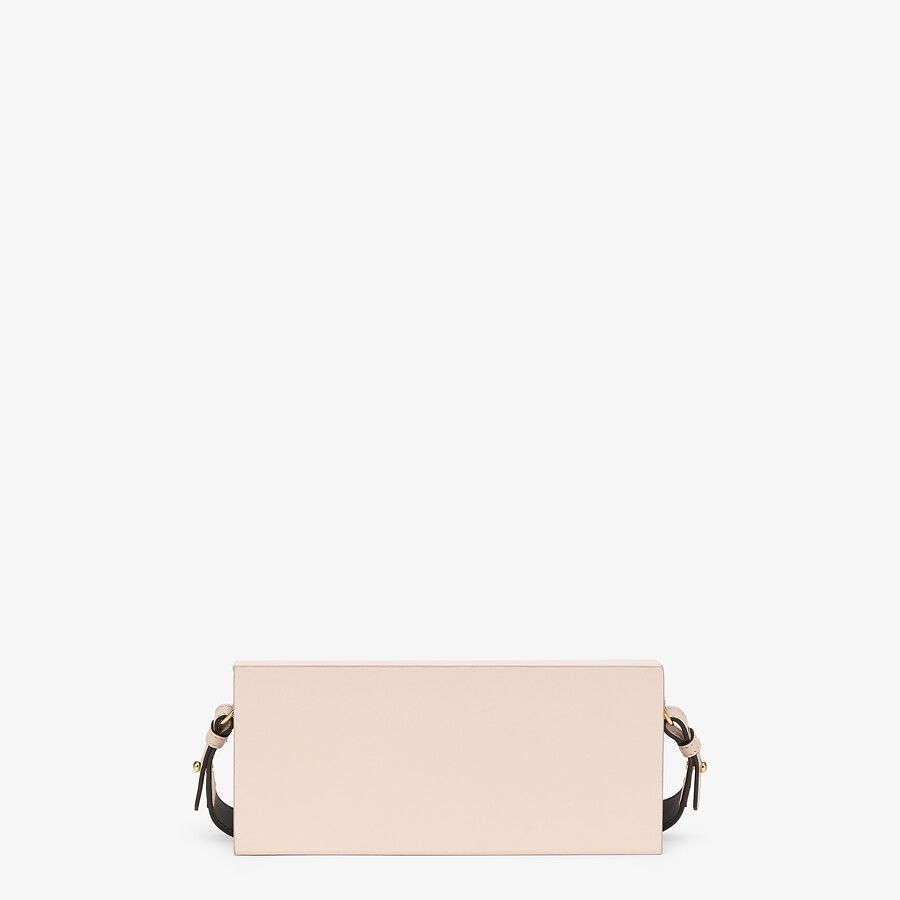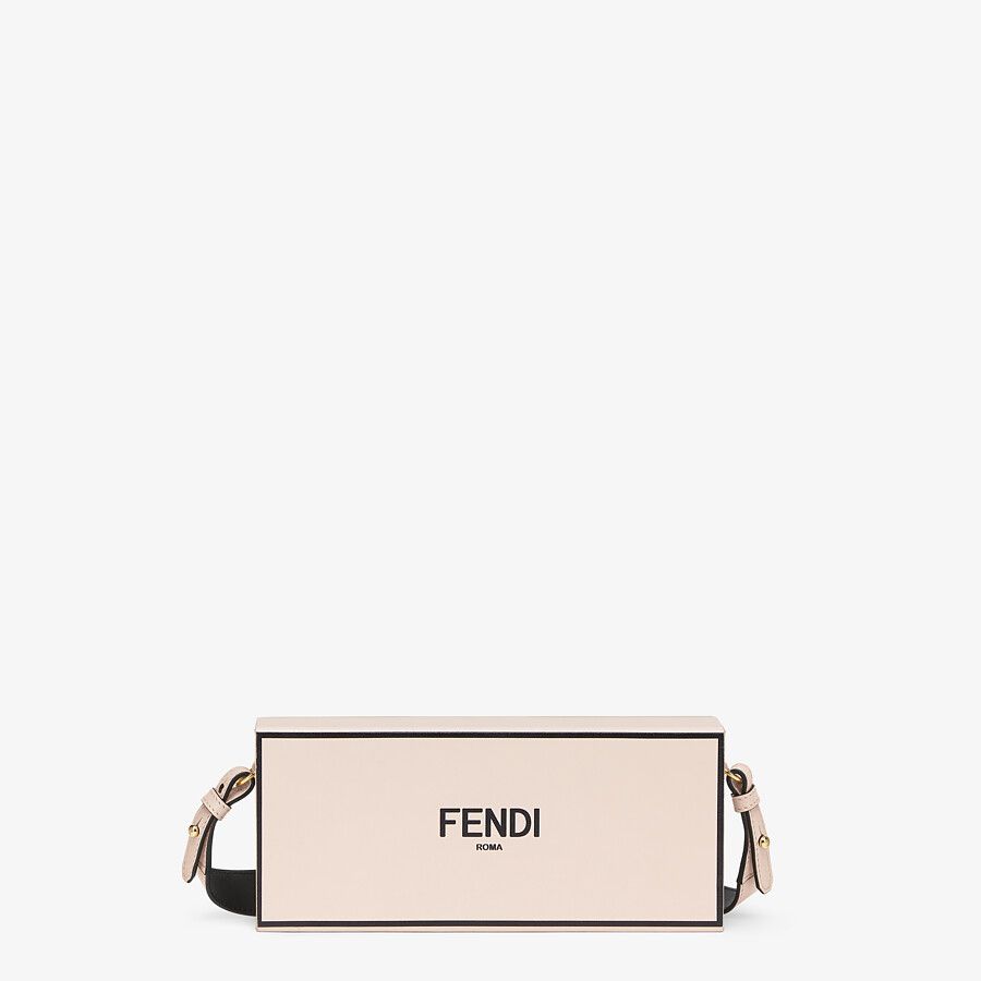 Rigid horizontal bag inspired by the iconic Fendi packaging, with magnetic clasp. The cross-body strap is adjustable and detachable. Made of wood. Covered in pink leather with screen-printed parchment effect. Embellished with embossed edges and Fendi Roma lettering hand-painted in black. Alcantara® lining. Gold-finish metalware.