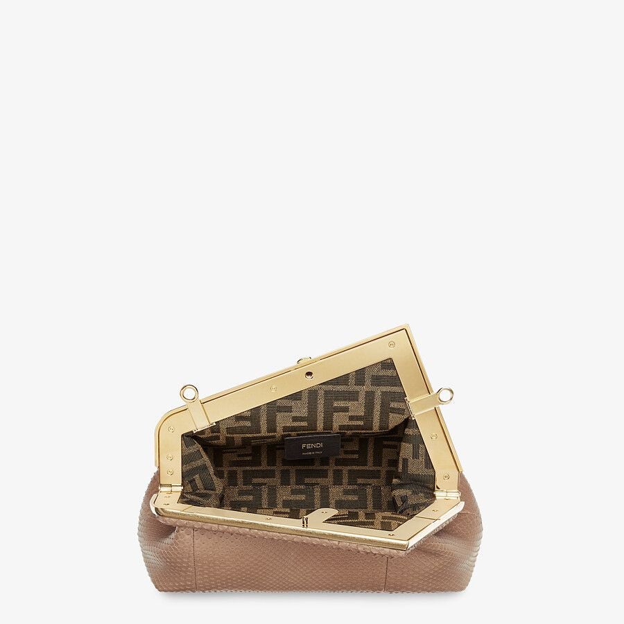 Small Fendi First bag made of exquisite, beige python leather. Decorated with an F-shaped snap clasp covered in tone on tone python leather.