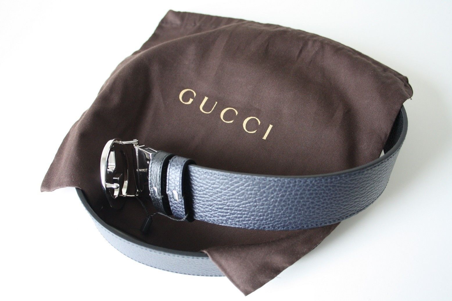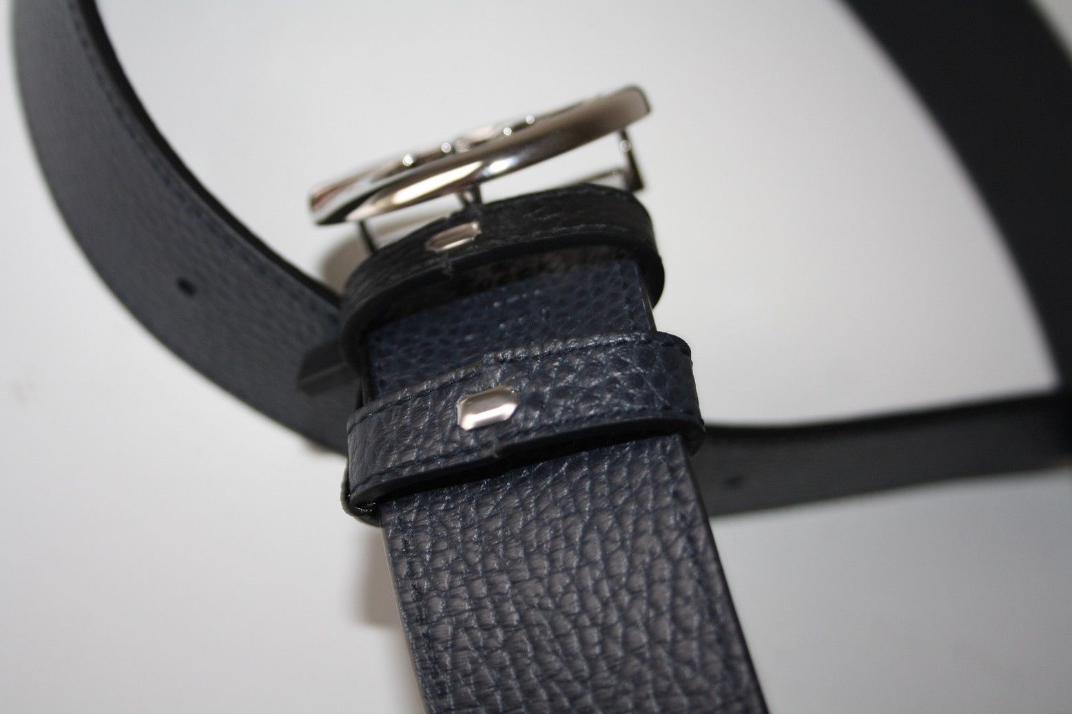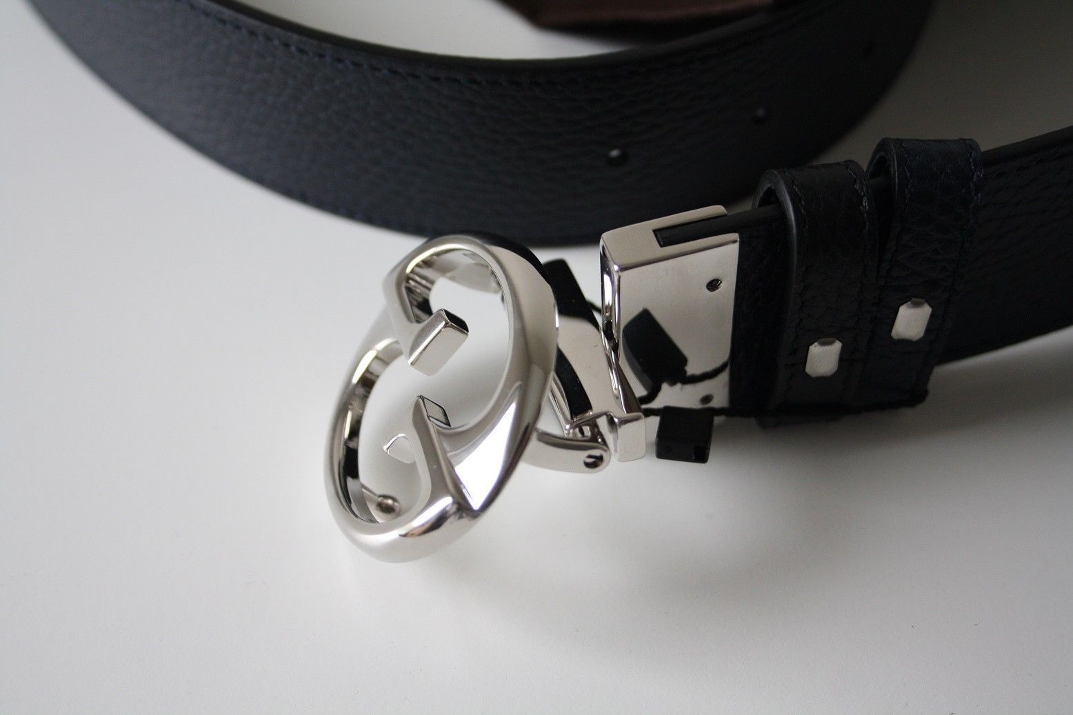 Gucci Reversible Black and Navy leather Belt with Silver Gucci logo Size 38 449715