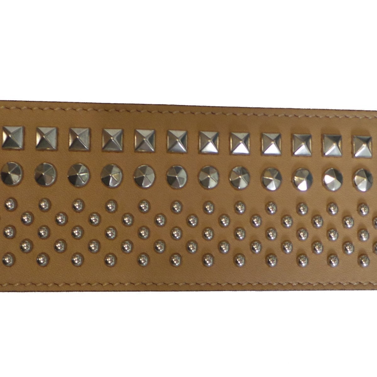 Gucci Studded Beige Leather Belt W/Skinny Silver Buckle 100/40 388985 2754 adds flair and beauty to any outfit. Worn with pants or a dress this belt will be a great accessory to kick your wardrobe up to the next level.