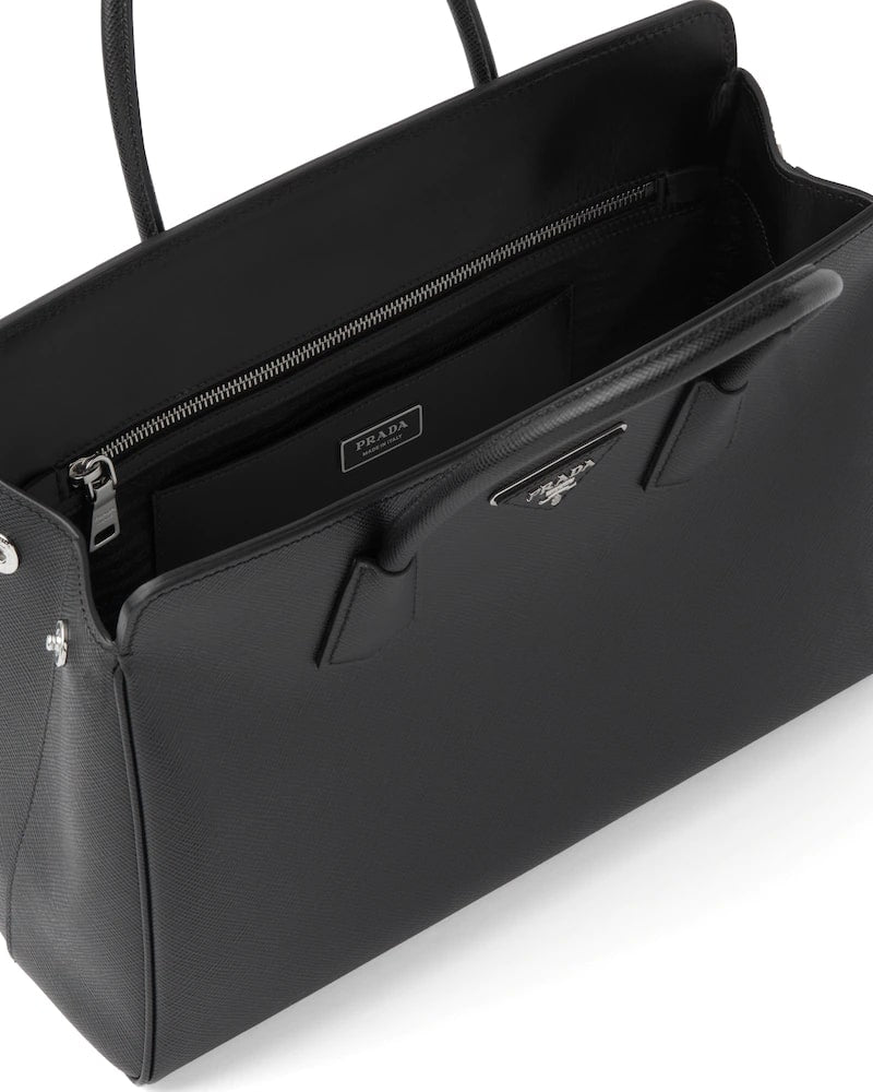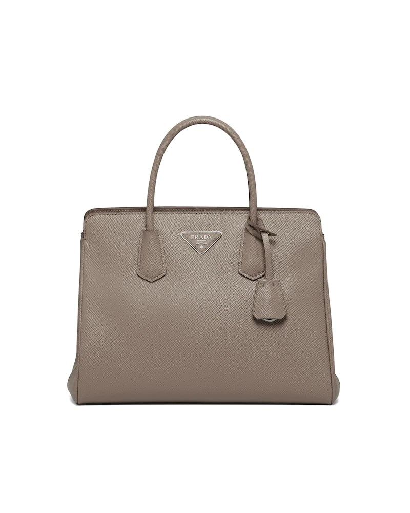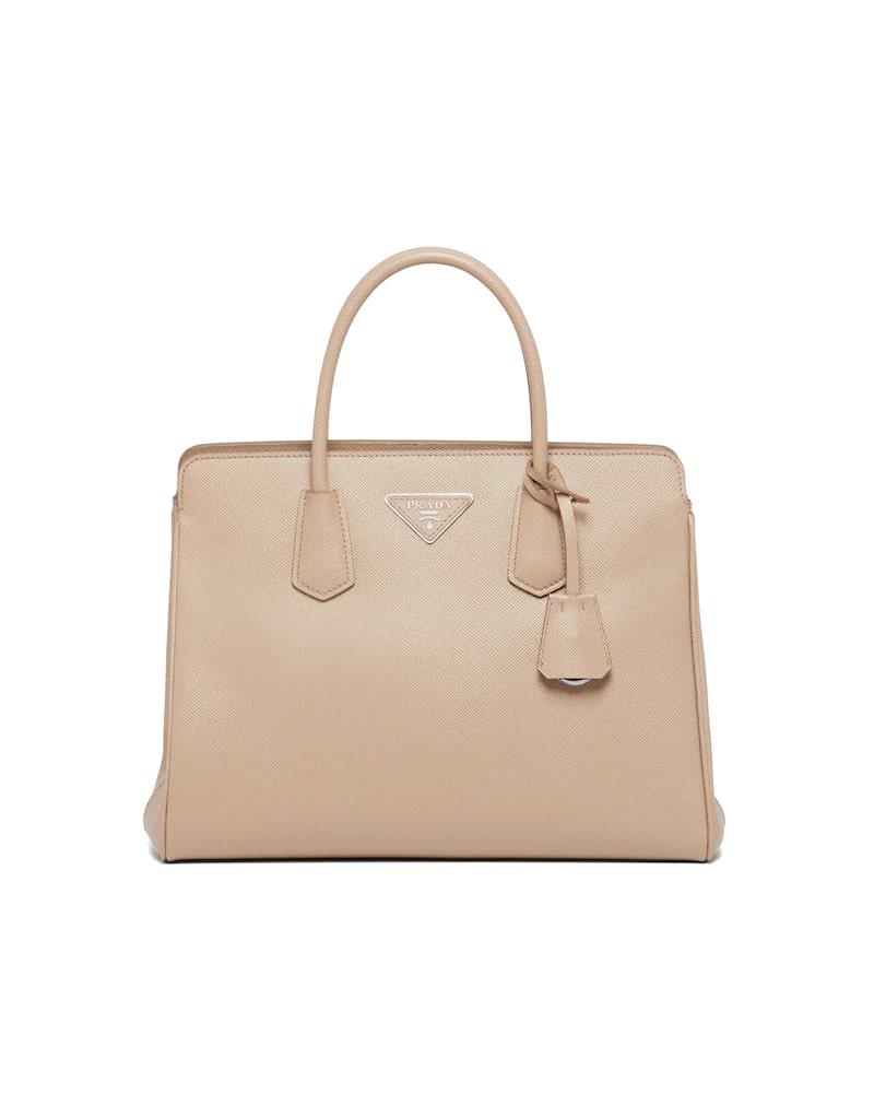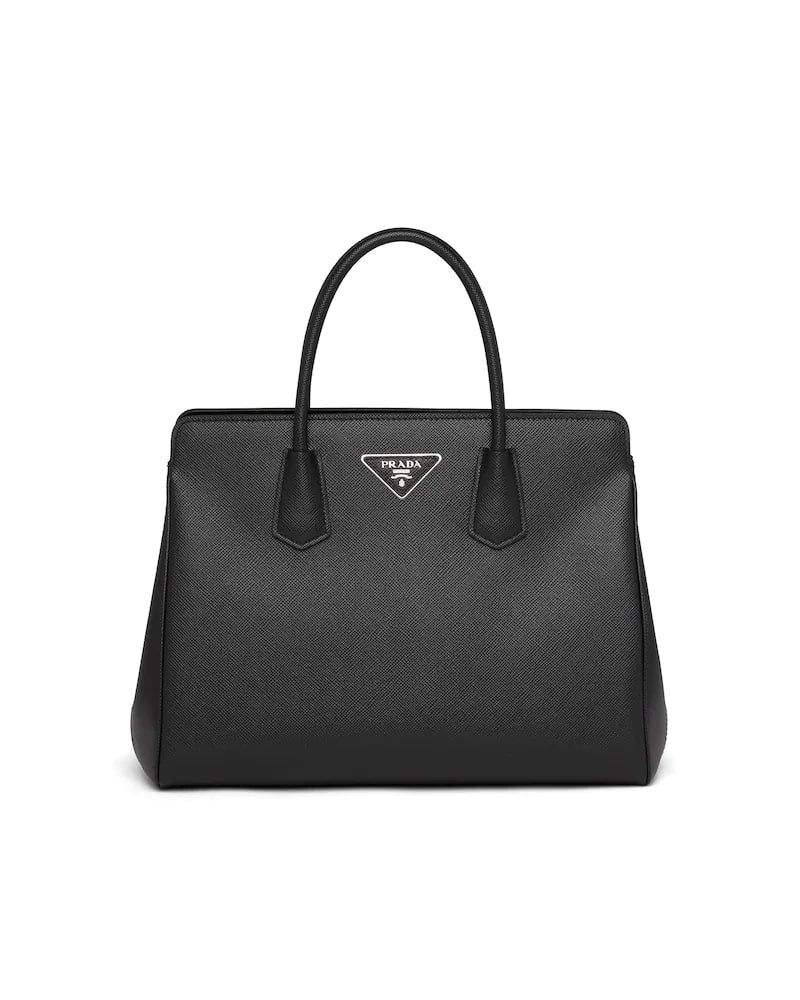 This handbag with a classic, structured design is made of Saffiano leather, an iconic material of the brand characterized by the crosshatch motif and waxed finish. The triangle logo, first introduced on the trunks designed by Mario Prada, decorates the front. The accessory equipped with a double handle and detachable leather shoulder strap can be worn in several ways.