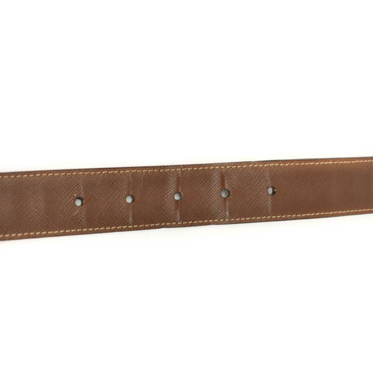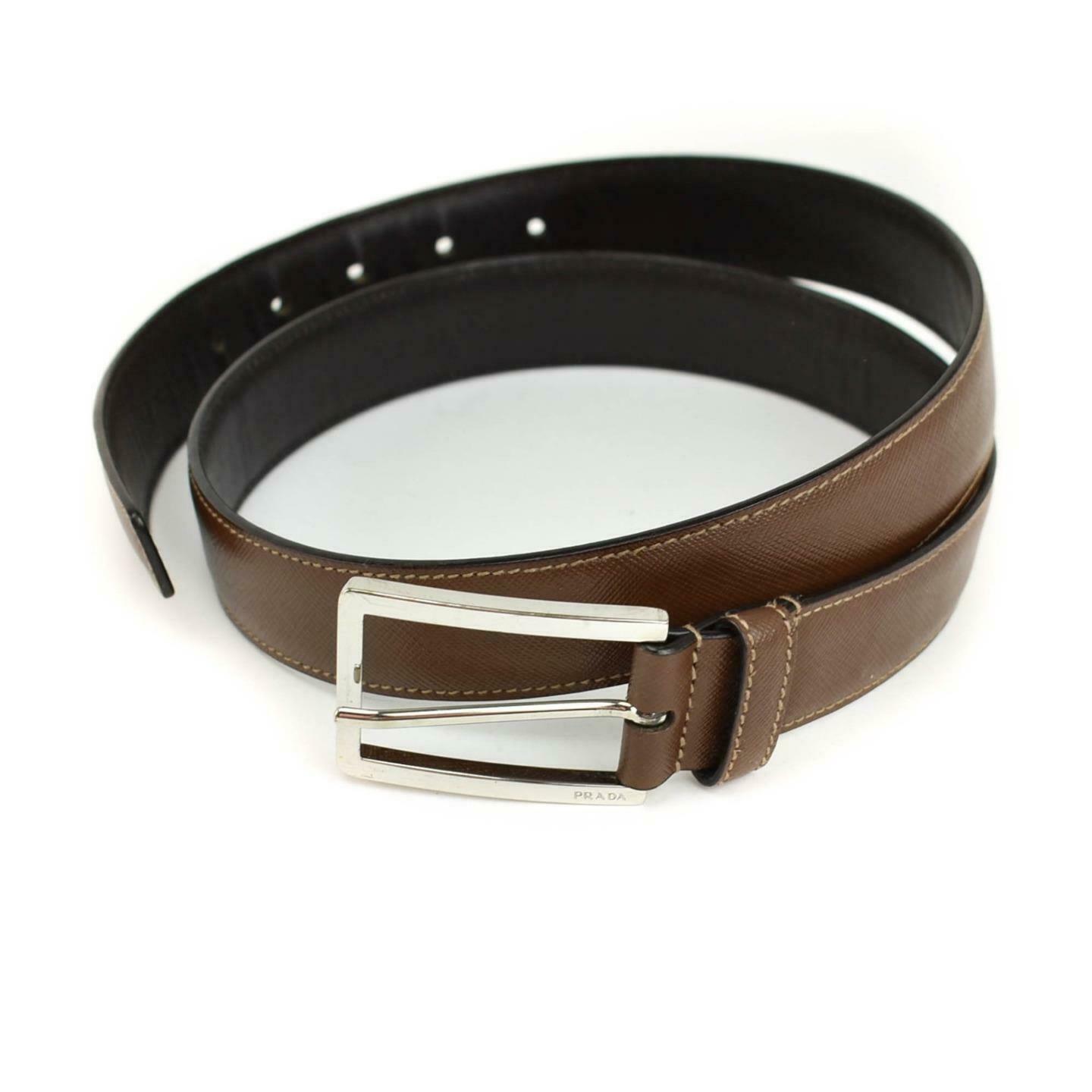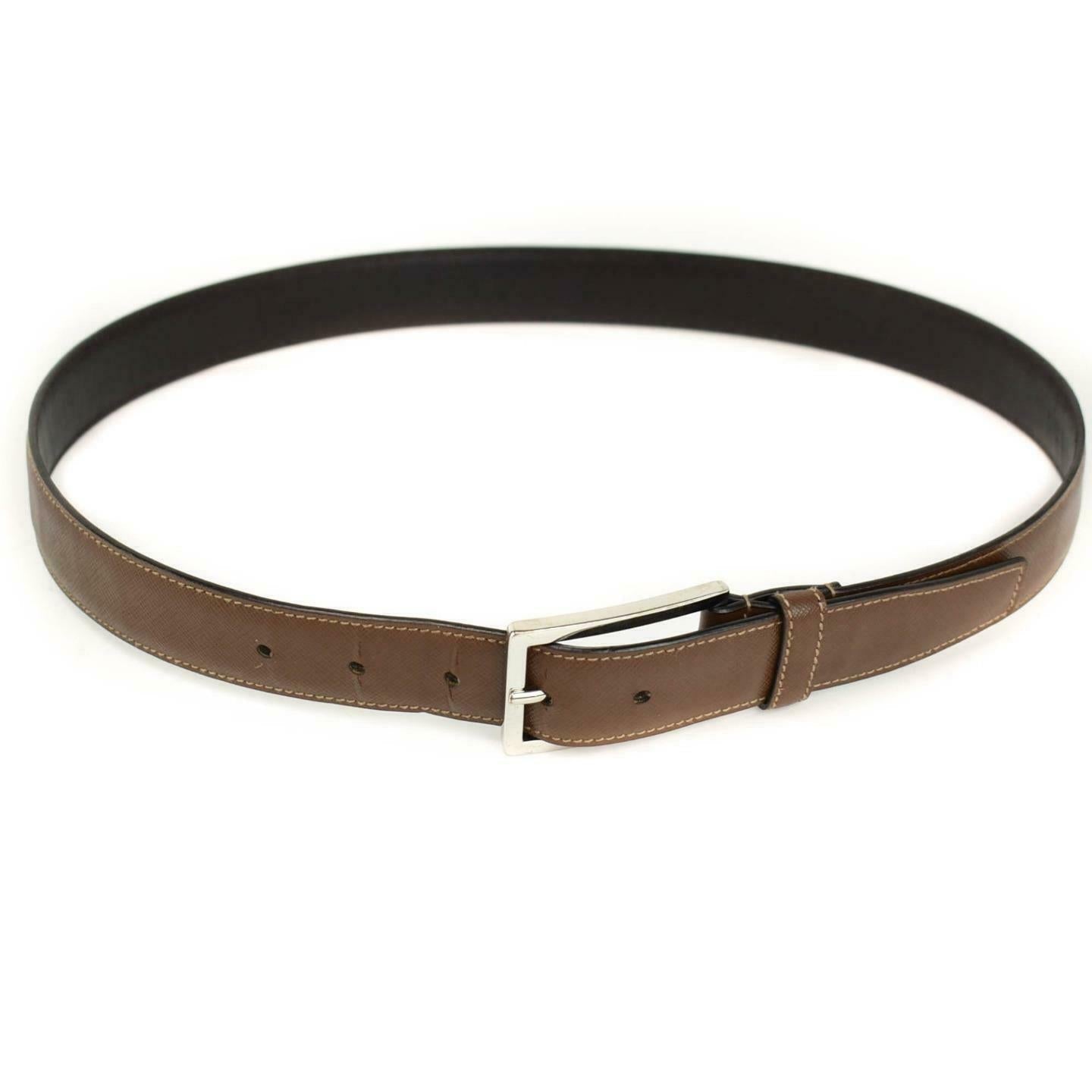 PRADA: Brown, Saffiano Leather & Logo Buckle Belt fits 35" to 38" (mx)