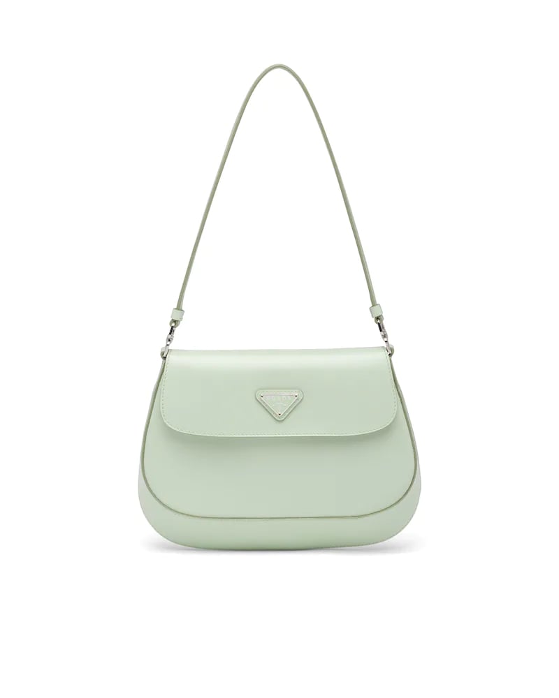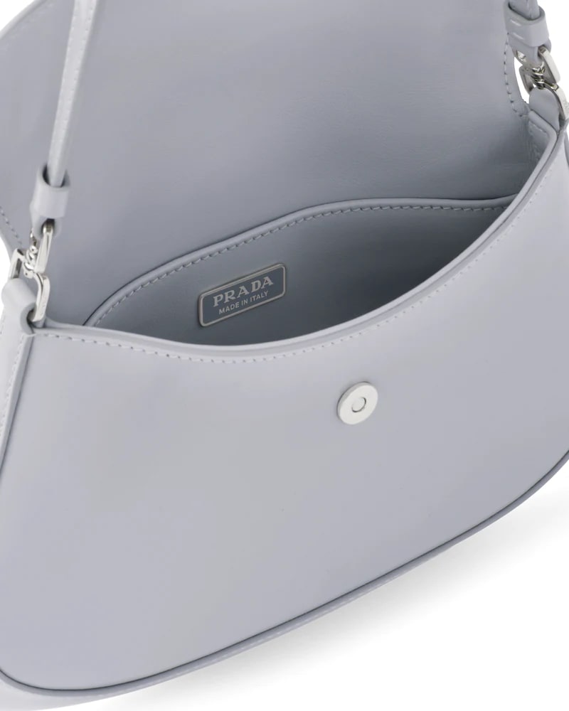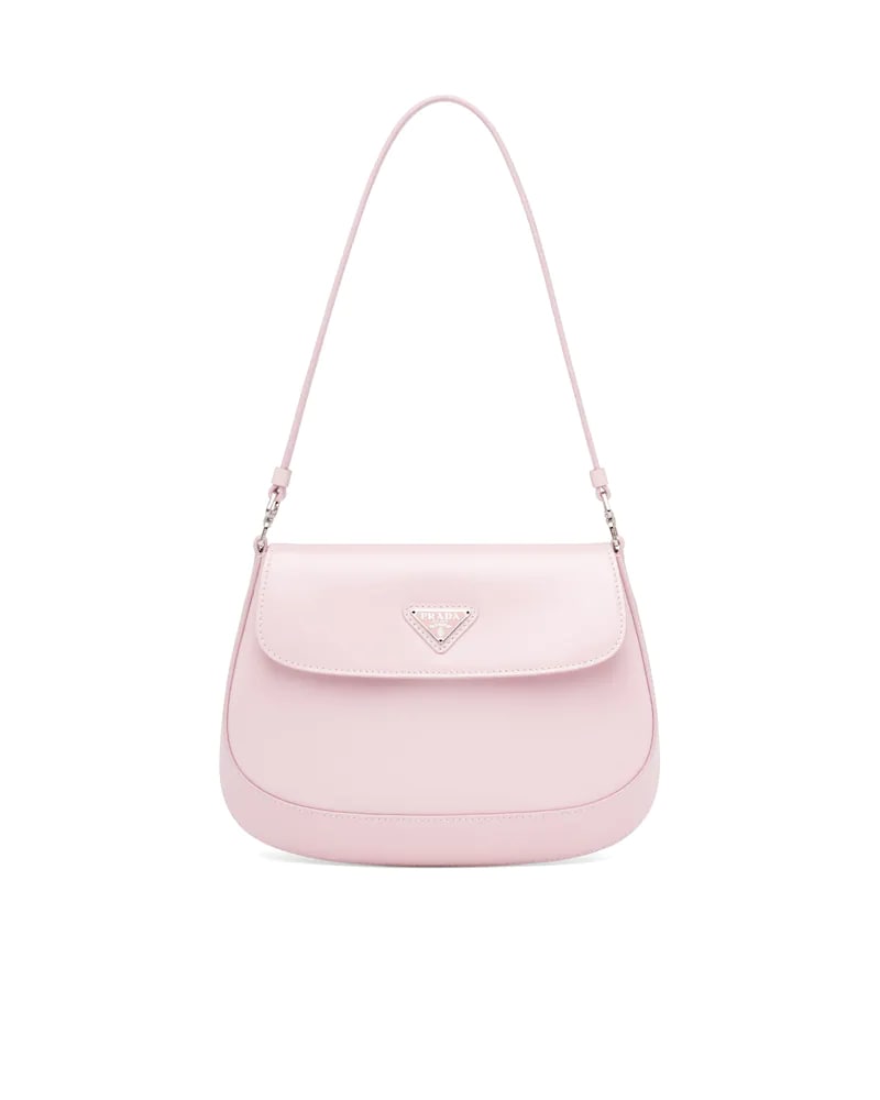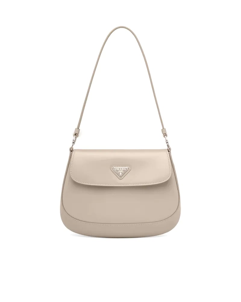 The Prada Cleo bag with sophisticated allure reinterprets an iconic design of the brand from the 1990's. Sleek curved lines emphasized by the particular construction rounded on the bottom and sides give this flap bag a soft, light look. Brushed leather, a modern and versatile material that is distinctive in Prada collections, is ideal for creating always new combinations and contrasts. The enamel triangle logo decorates the silhouette.