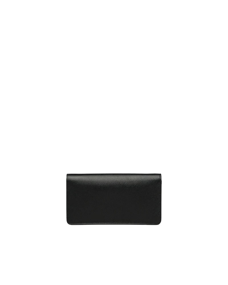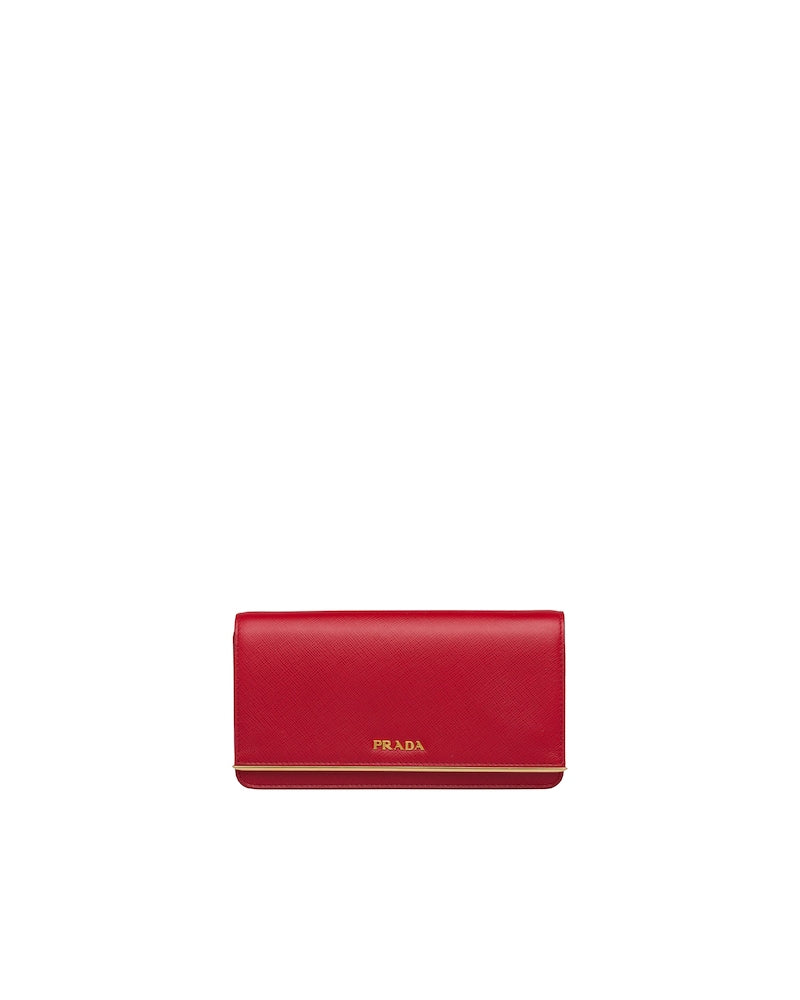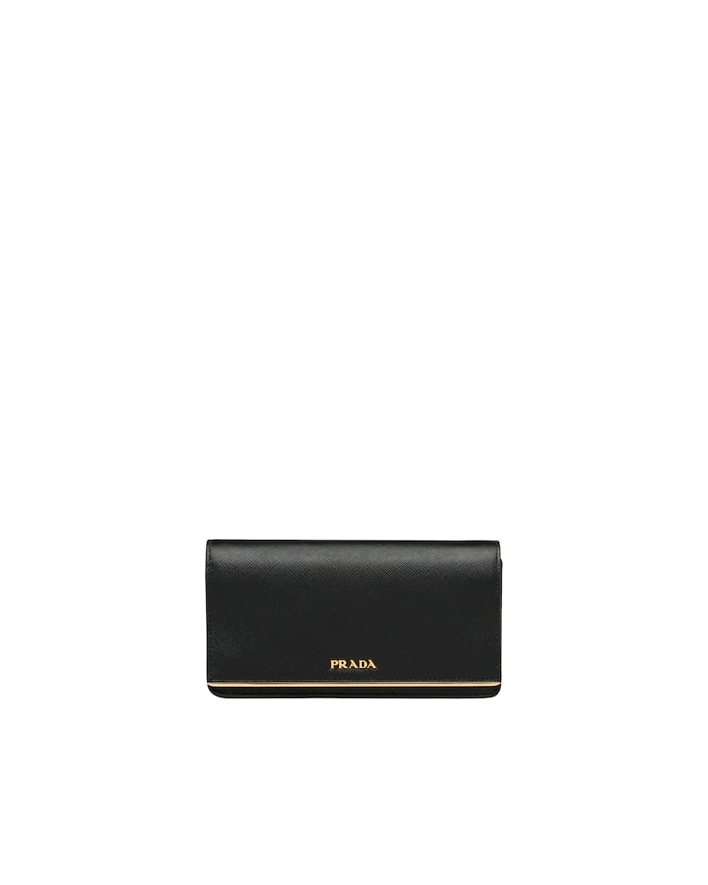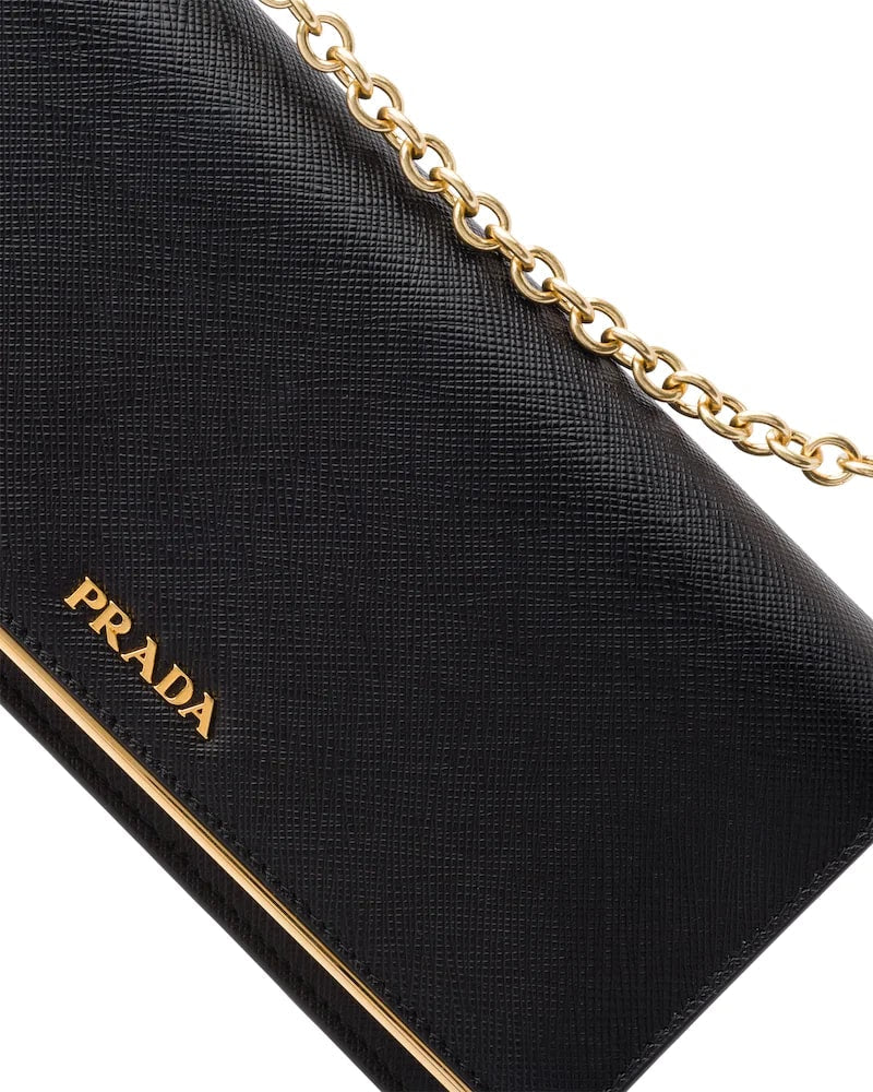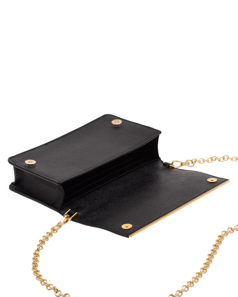 This leather mini-bag with modern, refined lines has a chain shoulder strap. The metal logo in a contrasting color decorates the flap.