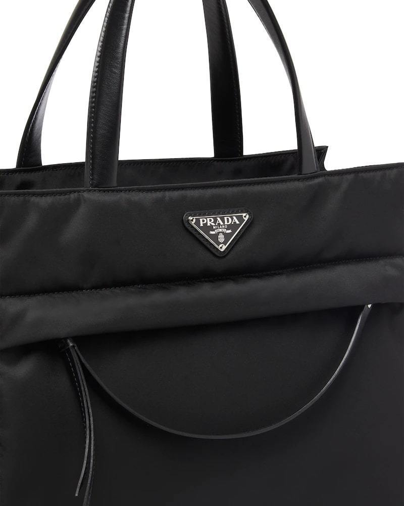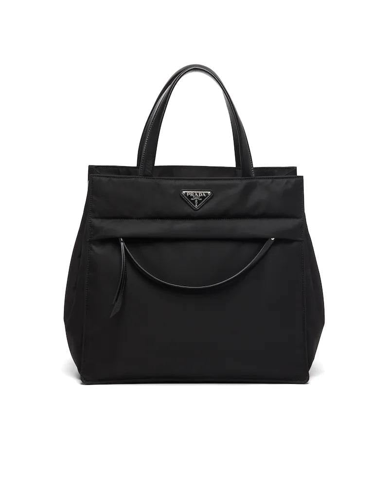 This classic tote with leather handles is made of padded nylon, an iconic material of the brand. The accessory with snaps on the sides has pockets on the front and back. The metal hardware and the enameled metal triangle logo brighten the design.
