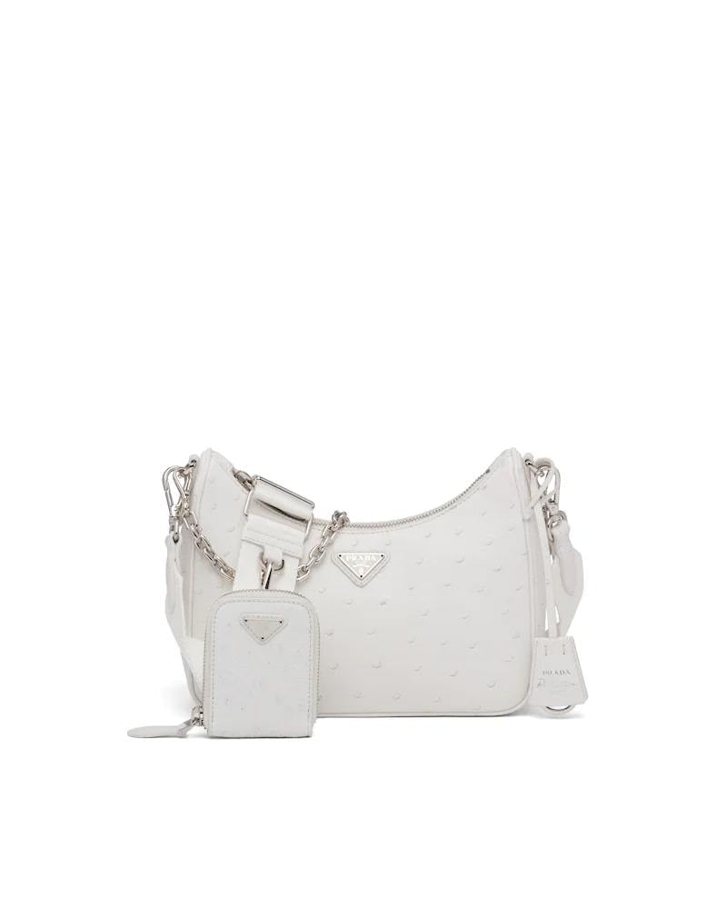 An iconic silhouette with sophisticated details that enhance the design: Prada plays with the classic shoulder bag, presenting the 2005 Re-Edition in ostrich leather. The accessory comes with a removable pouch and keychain that makes it unique and functional.