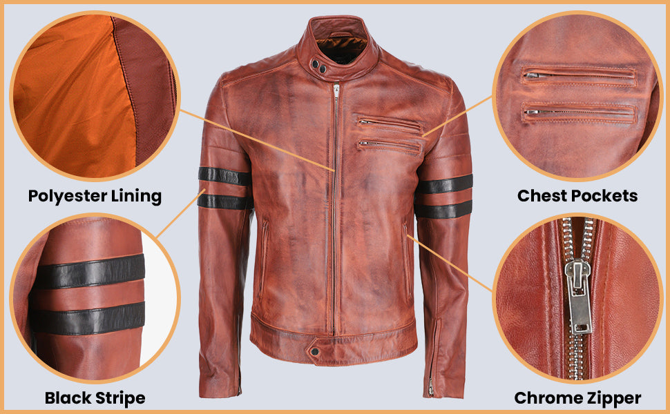 Don’t let the winter cold get you down! Add a touch of edge to your winter look with our Mens Black Stripe Brown Leather Jacket