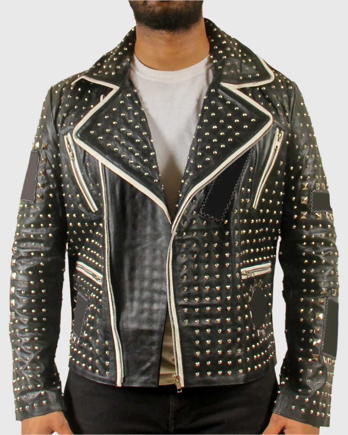 The Mens Black Studded Jacket comes in a striking black color scheme that complements any outfit. Its versatile design makes it suitable for various occasions—be it a bike ride, a casual outing, or a rock concert.
