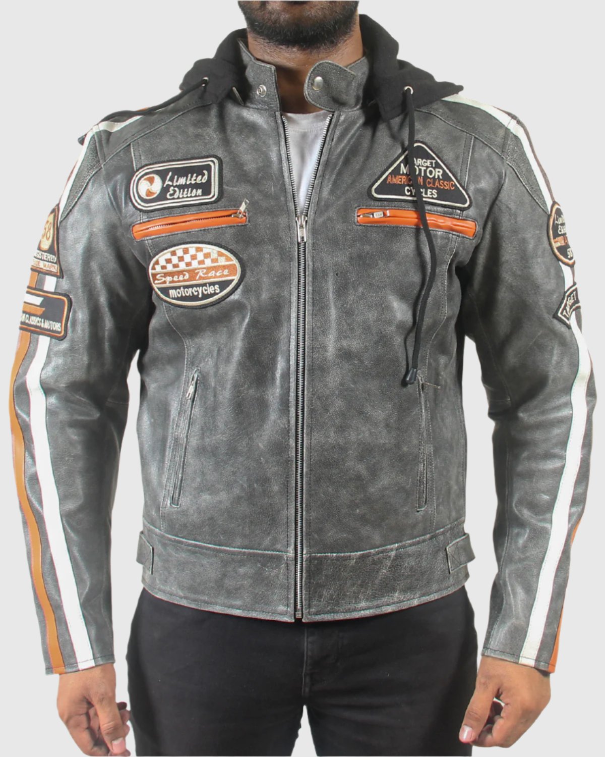 This Mens Leather Moto Jacket also comes with a removable hood, allowing you to customize your look according to your preference. Whether you’re aiming for a casual vibe or something more rugged, this jacket adapts to your style. The retro stripes on the sleeves add a touch of vintage charm, making this jacket a timeless piece that stands out in any crowd.