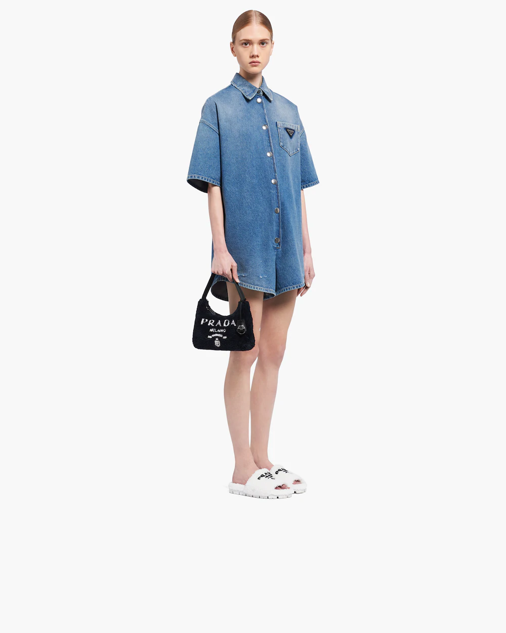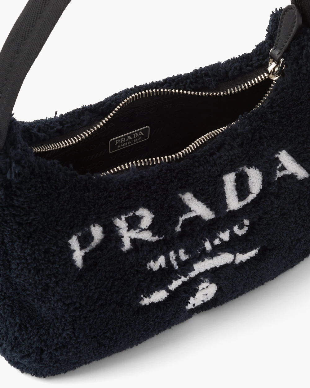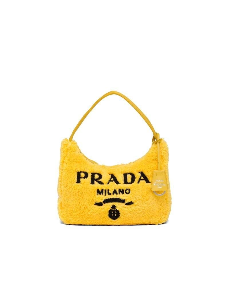 Vivid color contrasts and an ironic character define the Re-Edition 2000 mini hobo bag in soft terry with a summery mood. Prada's iconic lettering logo embroidered on the front embellishes the silhouette, a reinterpretation of a historic style of the brand.